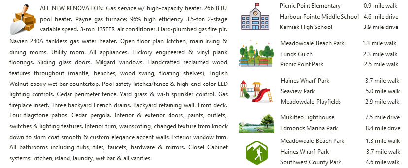 Amenities include Wi-fi enabled fridge in the stunning kitchen, Wi-fi Sprinkler system, RV parking & utility room. Minutes to Meadowdale Park, Picnic Point & Mukilteo Schools. Only two (2) miles drive to Hwy 99 & Hwy 525 that connects to I-405 & I-5. Seller Pre-Inspection Report is available upon request & 1 year Platinum Home Warranty with pool coverage, is provided to the buyer.